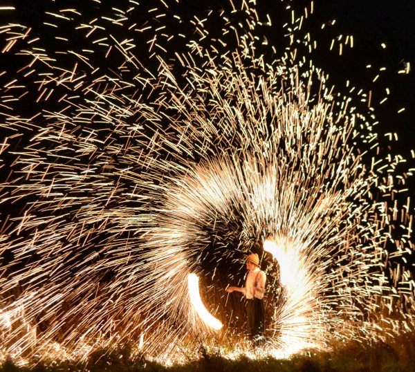 Als Feuerjongleure bieten wir Ihnen eine spektakuläre Feuershow, bei der gekonnt die Fackeln fliegen. Helle Feuerspuren und -kreise werden in die Nacht gezeichnet, wenn wir mit brennenden Stangen und Feuerketten herumwirbeln.